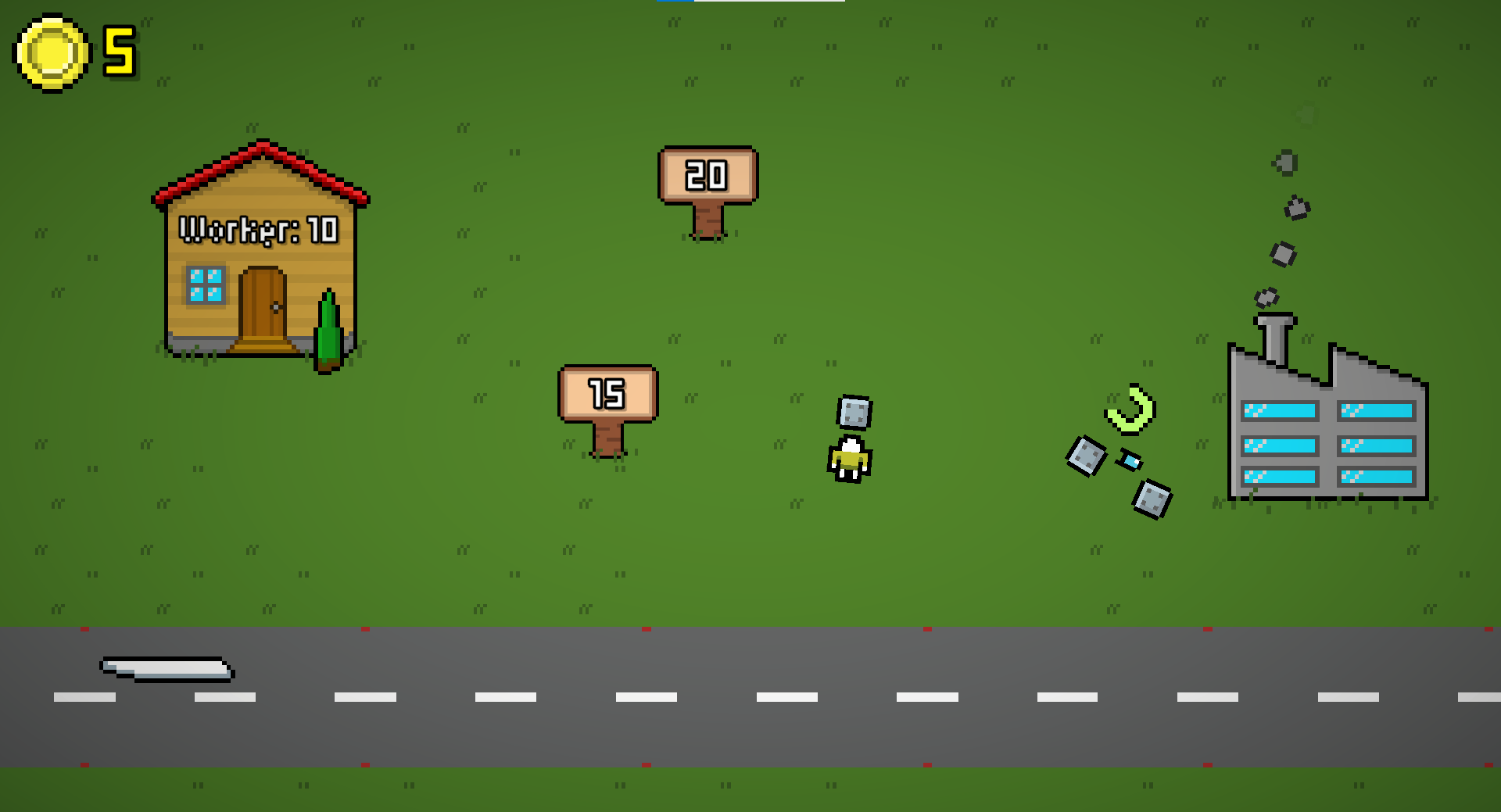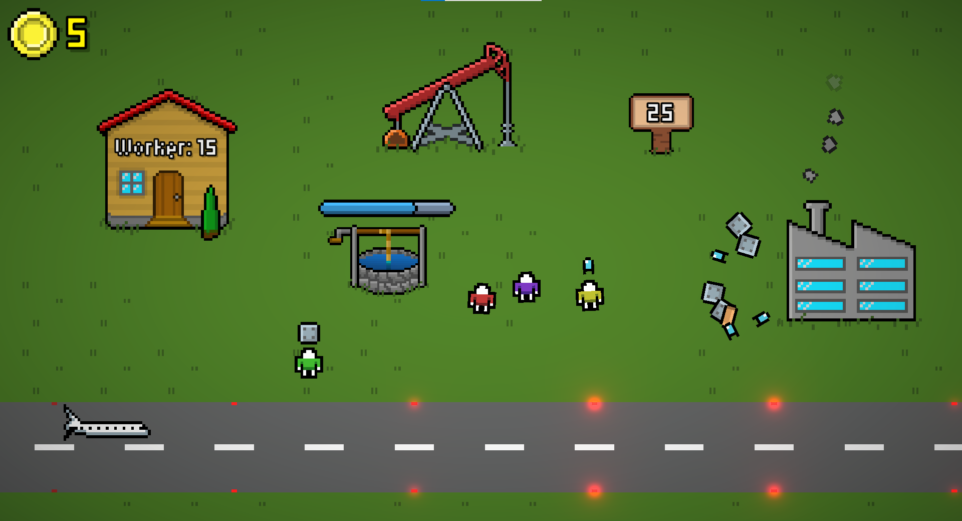 Click on the zero-cost signs to build basic buildings. When first parts appear, click on the grass multiple time to collect them. After collecting enough parts, your plane will take off and you will receive 5 coins, which can be used to buy more workers or new buildings.